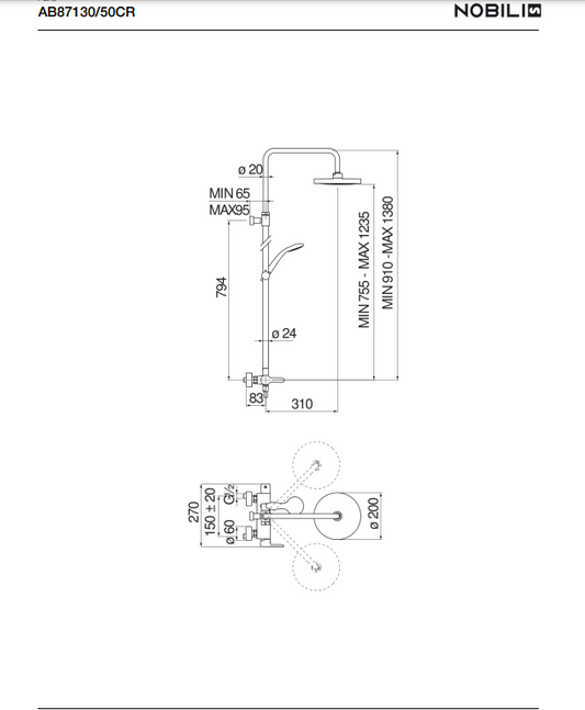 COLONNE DOUCHE, MITIGEUR MONOCOMMANDE MURAL AVEC BARRE TÉLESCOPIQUE AB87130/50CR, ABC