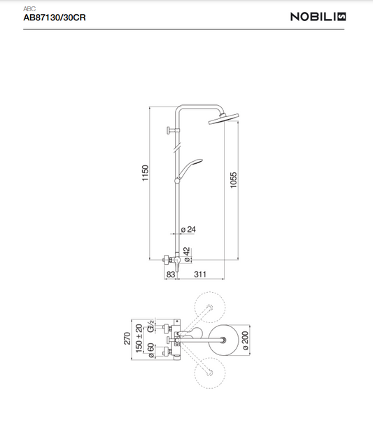 COLONNE DOUCHE, MITIGEUR MONOCOMMANDE MURAL AB87130/30CR, ABC