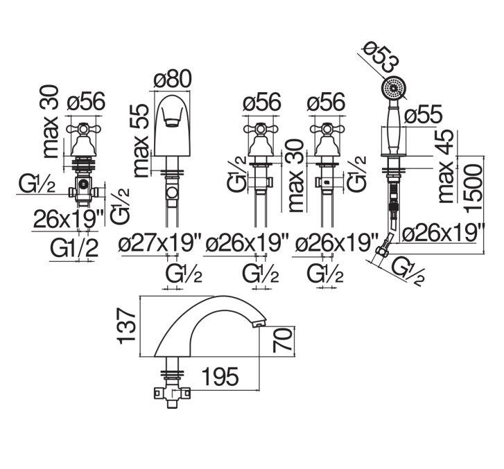 BAIN-DOUCHE, MITIGEUR 5 trous bord baignoire WEBK204/GRCR