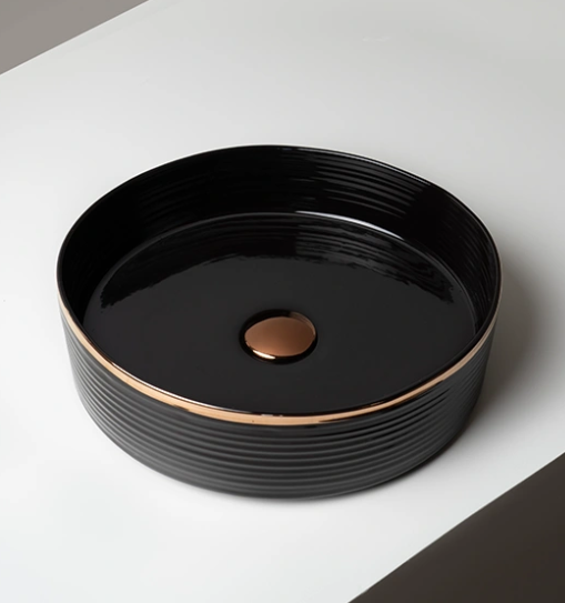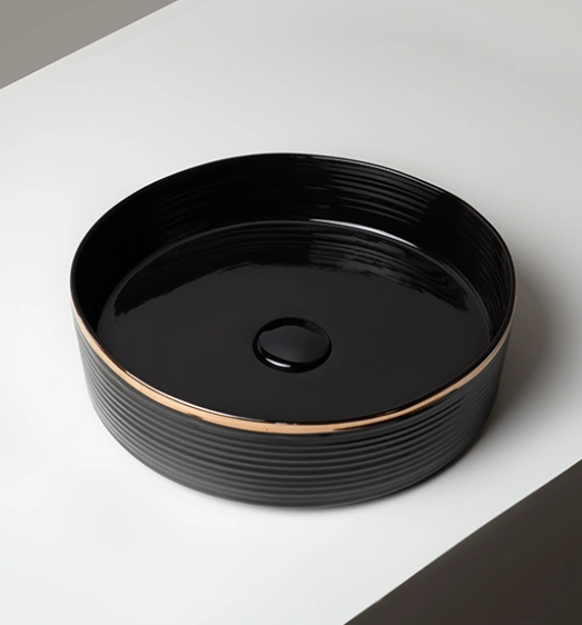 Vasque circulaire à poser Grès cérame tourné à la main Bordure de bague Ligne or noir brillant